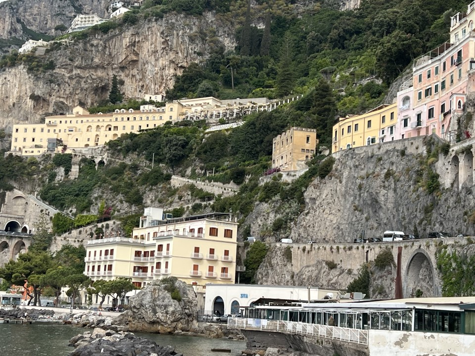 On bus - ready to tour Amalfi roads - narrow and difficult to maneuver Most homes, businesses and hotels built on mountainside It's a long way down! Notice the vineyards growing on the mountainside